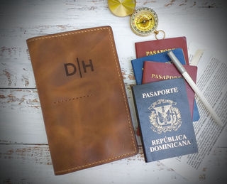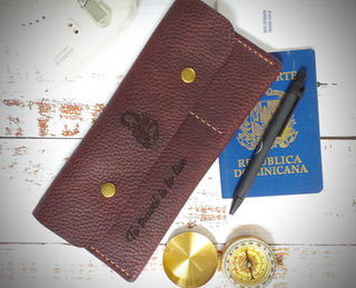 4 compartimentos para hasta 8 pasaportes; 3 para tarjetas, y 1 para tickets, tarjetas de embarque, dinero, etc. Area para lapicero. Cierre de botón.